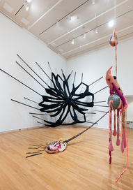 The soft sculptures range in content and form, from soft guns, webs made from clothing, internal organs, hand tufted rugs, text, and a very hungry caterpillar.